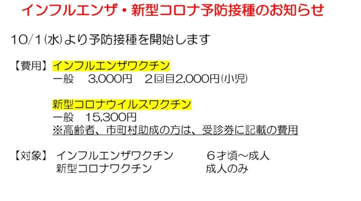 令和7年10月1日(水)より、インフル予防接種+新型コロナ予防接種を開始します。詳細は上記をご確認ください。